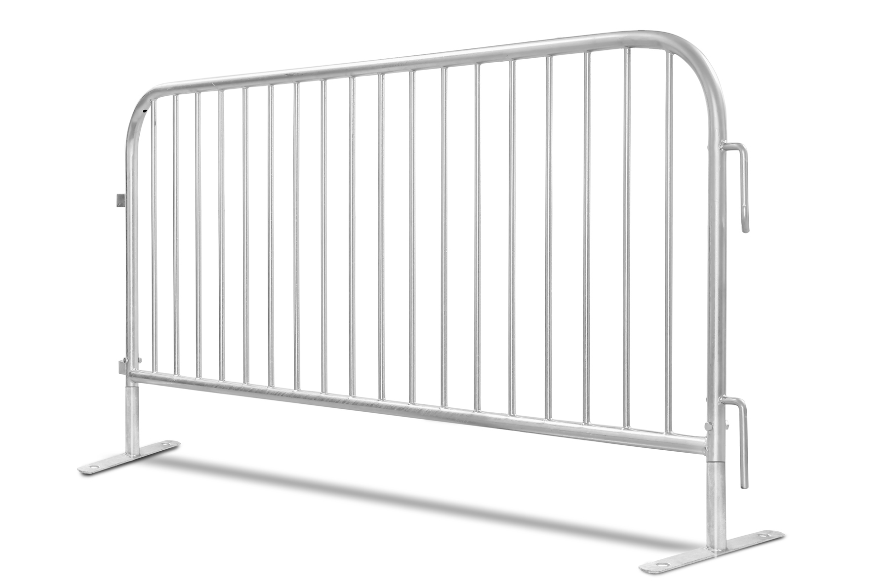 Economy steel barricade 90" long and 43" tall, weighing 38 Lbs. Interchangeable feet.