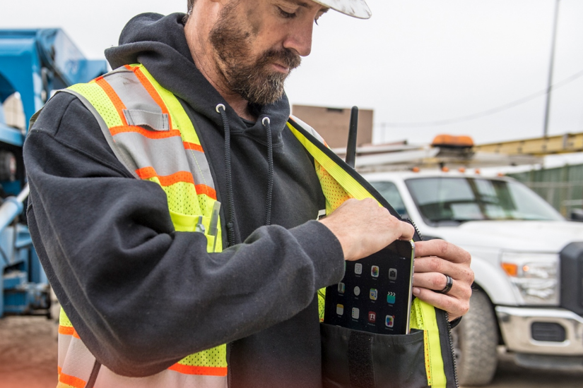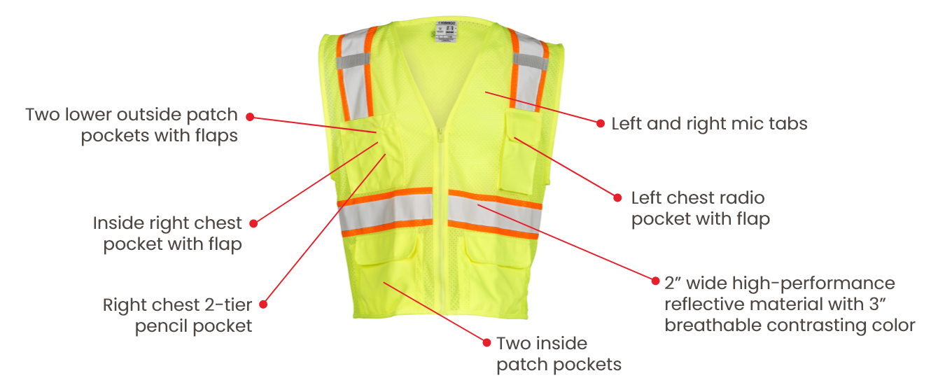 Whether the sun is setting or inclement weather is rolling in, contrast striping perfectly sets off Kishigo-quality reflective material. Stay focused on tasks with plenty of pockets for devices, tools, and ID, including a two-tier pencil pocket.