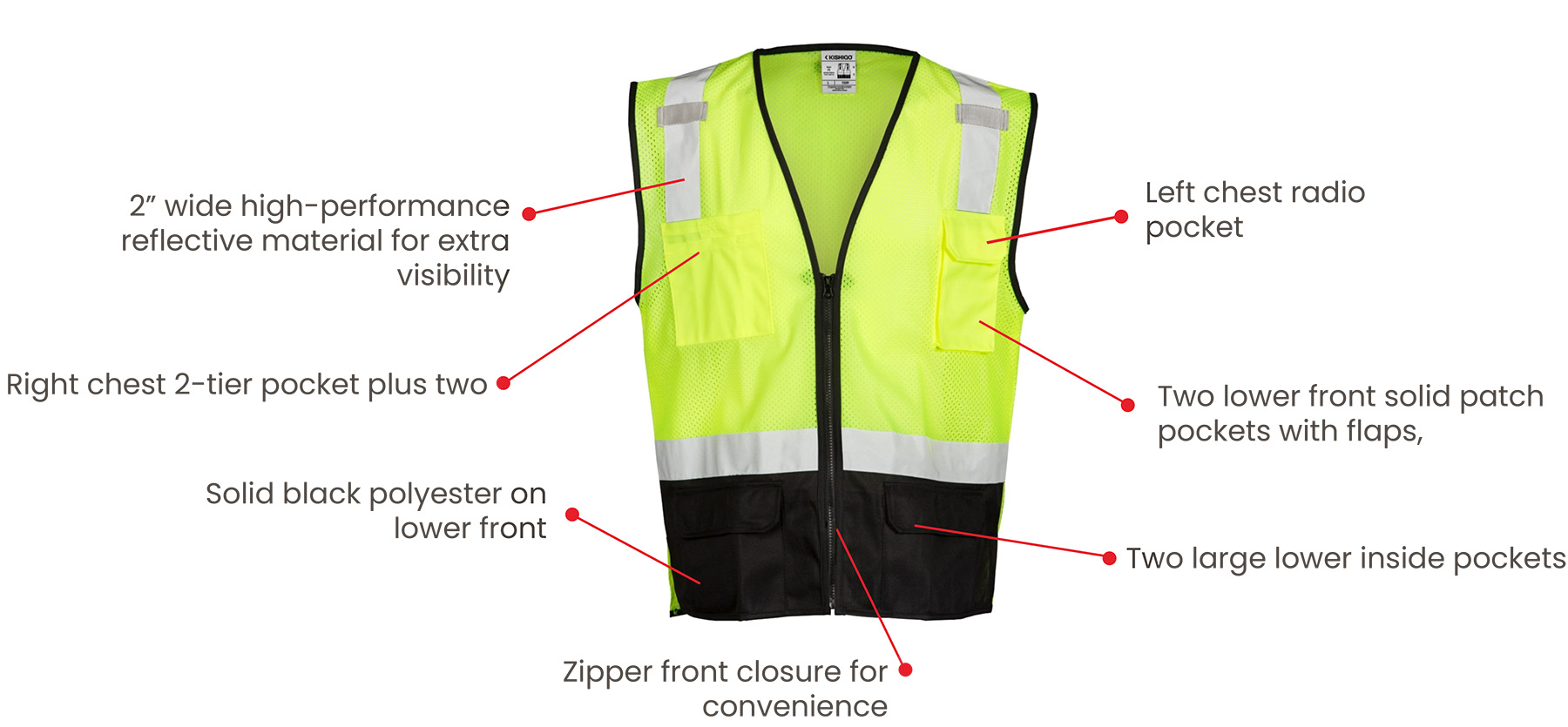 Get Class 2 visibility and durability that meets the job’s demands with the black bottom safety vest.