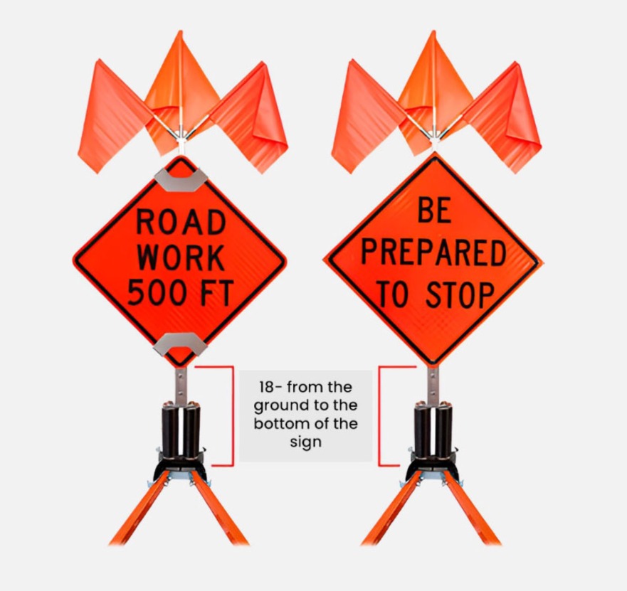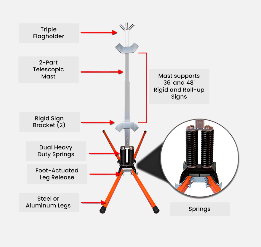 Keep signs visible and upright with a dual spring stand that’s suitable for rigid and roll up signs. Independently adjustable legs provide stability on curbs and uneven terrain. Sturdy, reliable stand for traffic control, work zone entry, road condition changes, and more.