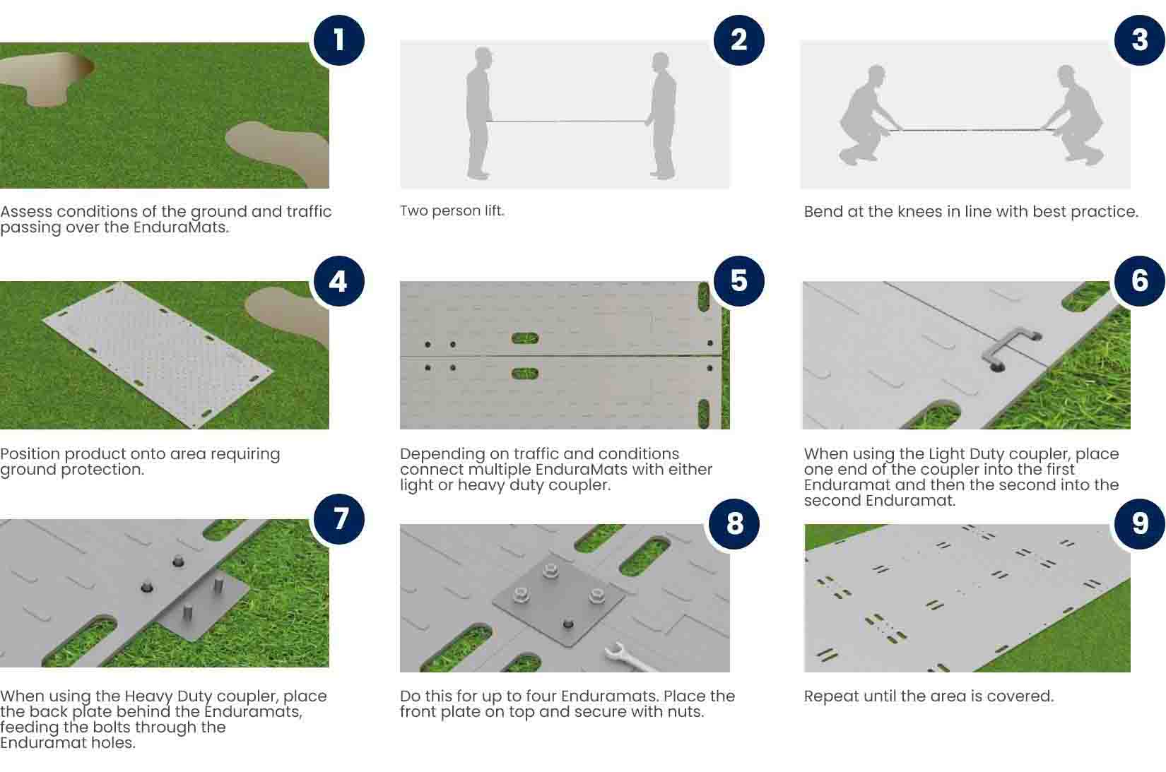For optimal use of the EnduraMat, keep multiple connectors on hand to securely assemble the mats in any direction needed. Spare connectors are helpful, as small parts can be easily misplaced during transportation and assembly. Using the mats without connectors can reduce their effectiveness, as vehicles and pedestrians may accidentally dislodge them.