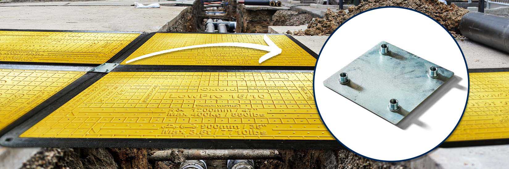 The 4-way connector allows you to attach multiple LowPro 15/10 Trench Covers to cover larger excavation areas. This connector secures the trench plates, infill, and ramps, allowing you to bolt everything into place for added stability. Due to the frequent assembly and disassembly of trench covers, small parts like the 4-way connector and bolts can be misplaced, potentially affecting your ability to connect the covers and ramps. To avoid this issue, maintain an inventory of spare parts.