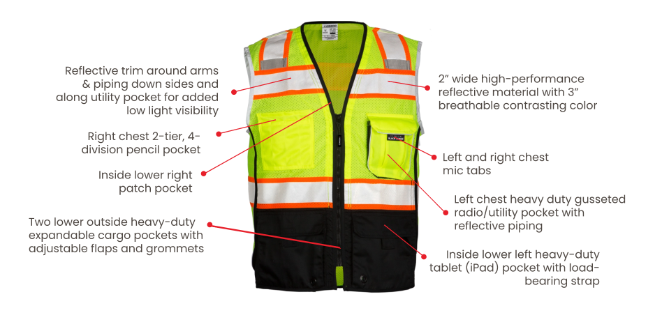 From the durable webbing reinforcing the zipper to the gusseted radio pocket, Kishigo has flawlessly optimized the Class 2 safety vest.