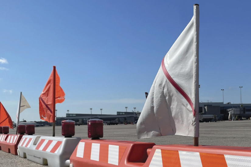 Mounted on a wooden pole, these warning flags are designed for easy insertion into the Yodock Aerocade or any water barrier with top holes.